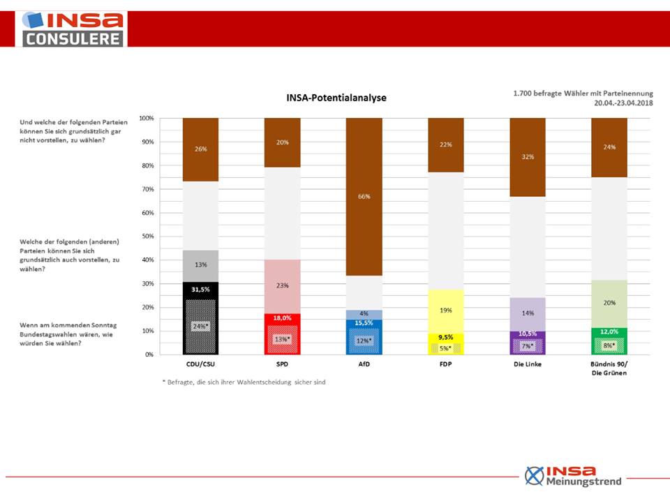 Das Delta zwischen denen, die es sich „grundsätzlich auch vorstellen können“, AfD zu wählen und denen, die es sich „grundsätzlich gar nicht vorstellen können“, AfD zu wählen, beläuft sich aktuell auf 15 %. Zumindest diese 15 % sind für uns als AfD im Sinne der Partei des Rechtsstaats und des politischen Realismus aus der Mitte der Gesellschaft grundsätzlich erreichbar. Der Kampf um diese Wähler ist kein Kampf gegen Windmühlen, wie, so sieht es doch ehrlicherweise aus, der Kampf um die Straße in der Hoffnung, dass sich ein Millionenheer Enttäuschter endlich aufrafft, die Altparteien wegzudemonstrieren. Nein, diese Lücke, um die muss es jetzt ganz bewußt gehen: Das ergeben zusätzlich zum bisherigen maximalen Potential von 19,5 % weitere 15%, also insgesamt fast 35%. Das wäre am Wahltag dann tatsächlich der höchste Wert aller Parteien. Darum muss es jetzt gehen, dann kommt Keiner mehr an uns vorbei, weder im Parlament, noch auf der Straße.