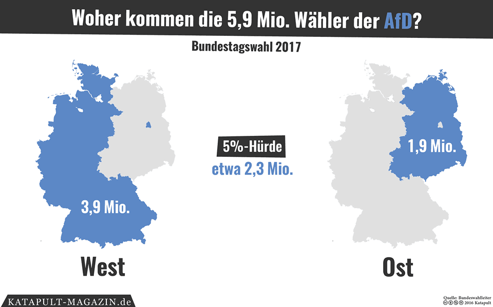 Aufgrund der Bevölkerungsverteilung reicht das Gewicht des Ostteils aber nicht aus, auch bei dort sehr sehr guten Ergebnissen um die 20% plus x bundesweit die 5% Hürde für die AfD zu knacken. Das heißt: Ohne den Westen geht es nicht. Jeder für die AfD ernsthaft Verantwortung tragende und nicht nur selbstbezogen denkende Funktionär muss immer die gesamte AfD mit im Blick haben.