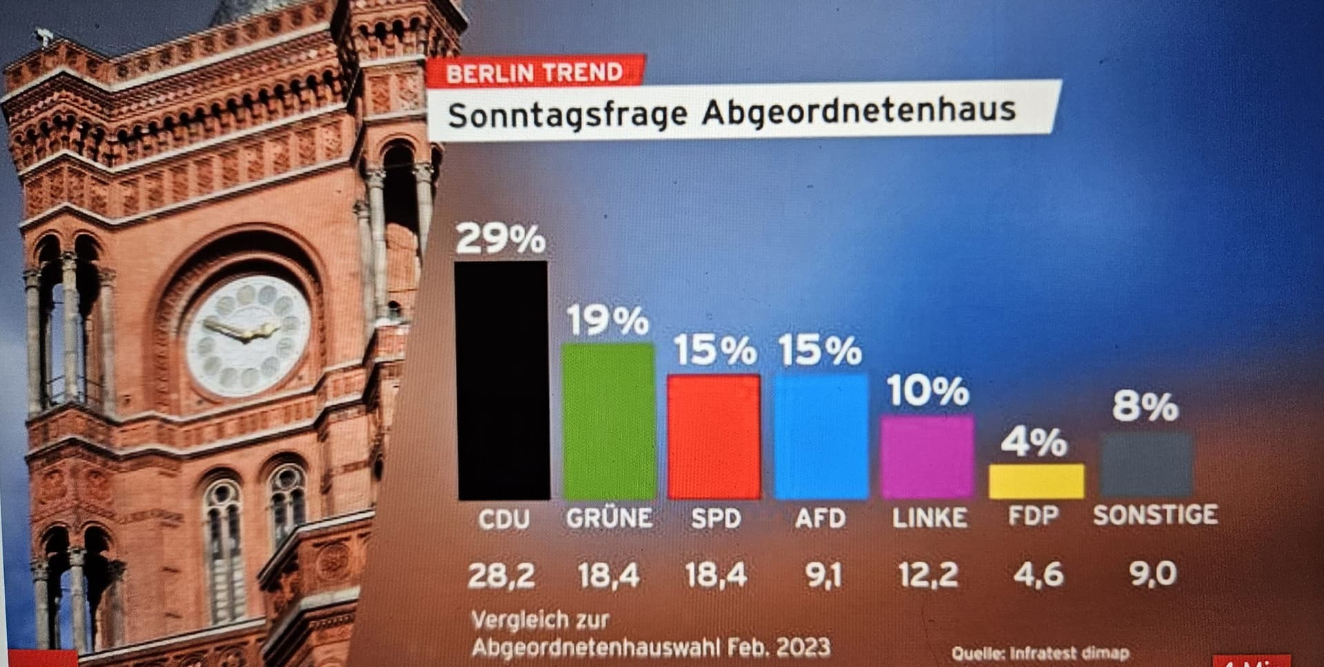 Damit erstickt der Regierende jede Hoffnung beim Wähler auf einen veritablen Politikwechsel, der der 10%ige Wählerstimmenzugewinn bei der 23-er Wiederholungswahl allein geschuldet war und ist. Diese 10% ist latent und wird manifest das erweiterte Investivkapital der AfD. Seine Regierung lässit sich vielmehr von der immer kleiner werdenden SPD treiben, die von der AfD in der Umfrage bereits eingeholt wurde. Und wenn diese SPD aus Angst vor dem Tod (in der Umklammerung der CDU) die Reißleine ziehen würde, um sich in der Opposition zu erneuern, leider auch da in die falsche Richtung, dann bliebe n der CDU noch die Grünen. Und dann danach der eigene Untergang. Der Trend zeigt es an: Politikwechsel? Mit ihm offenbar nicht.